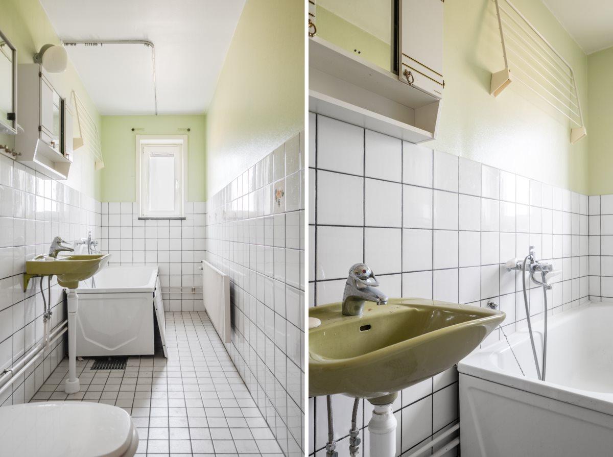 Badrummet är halvkaklat och utrustat med badkar. Här finns möjlighet att skapa ett modernt och stilrent badrum för den som vill sätta sin egen prägel.