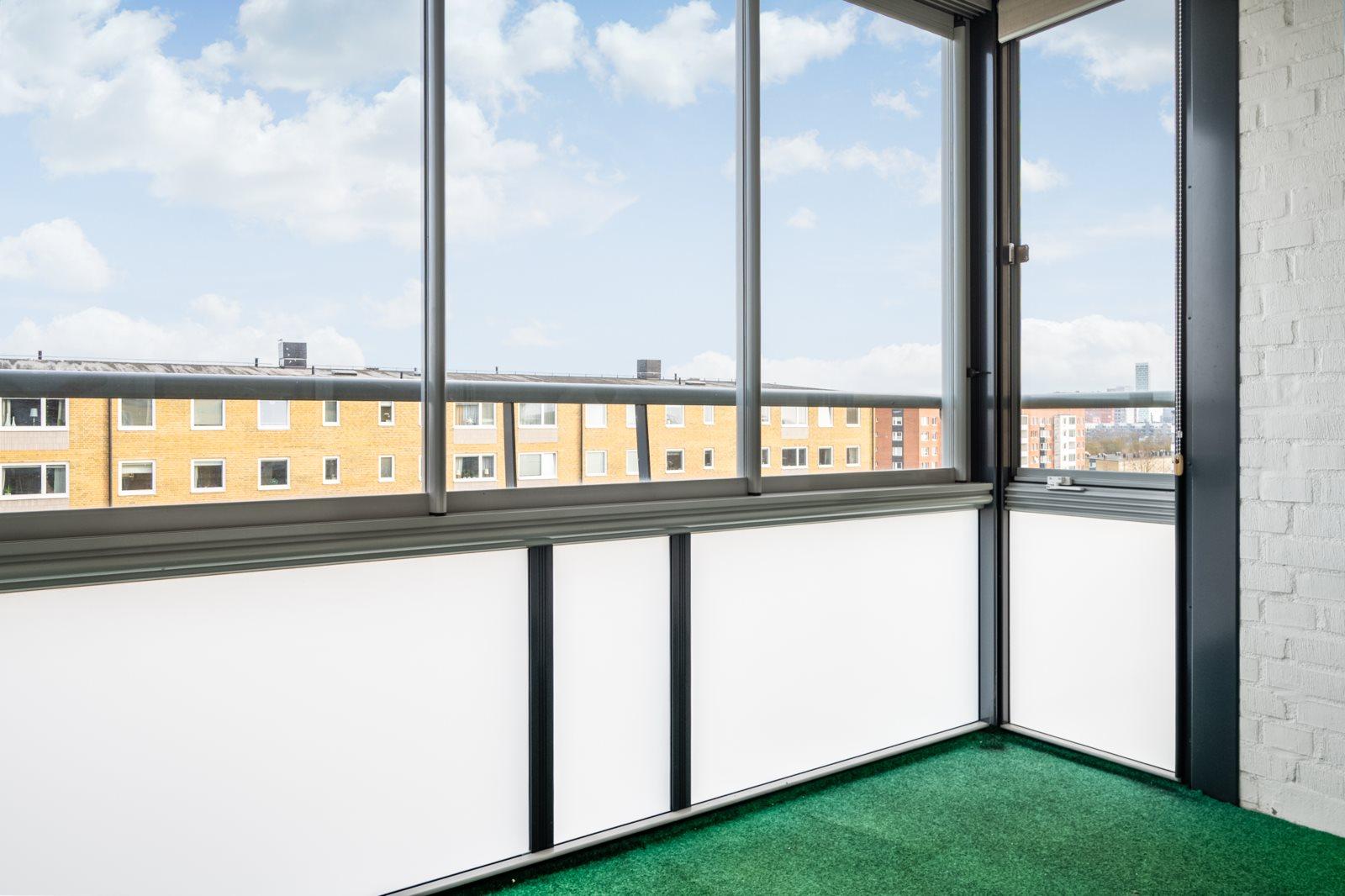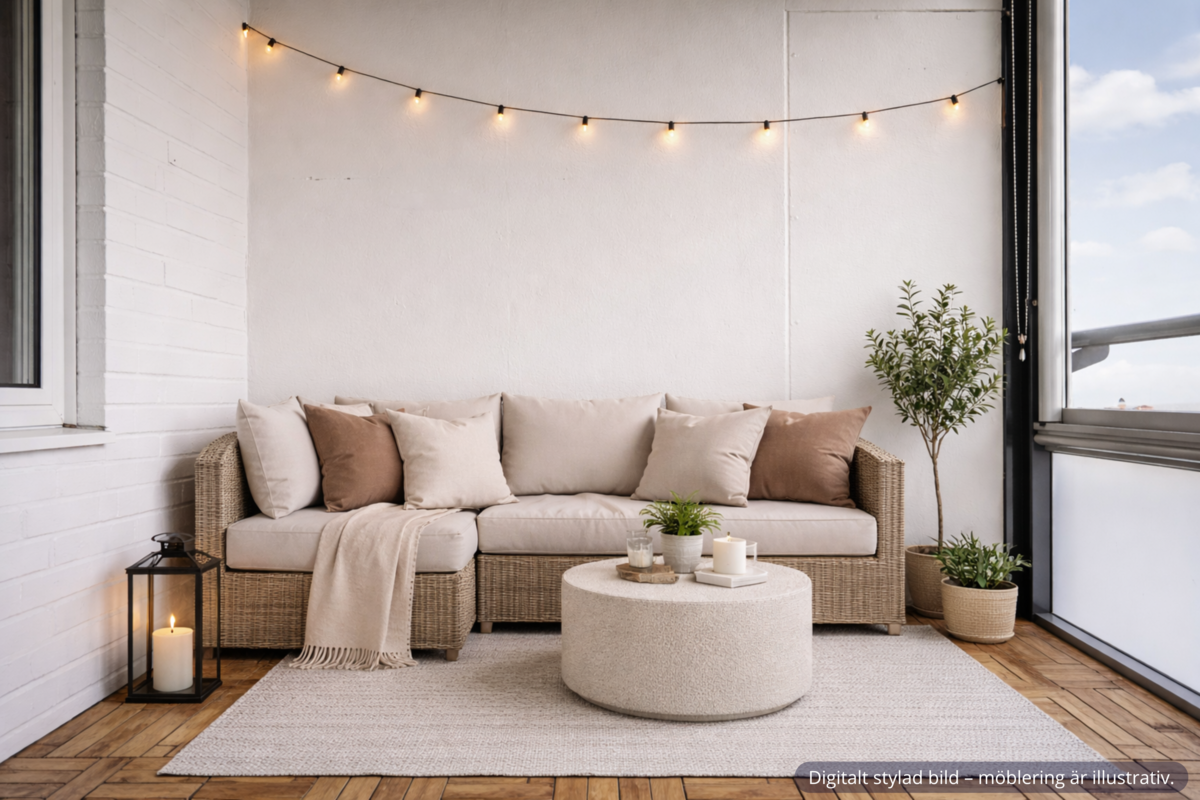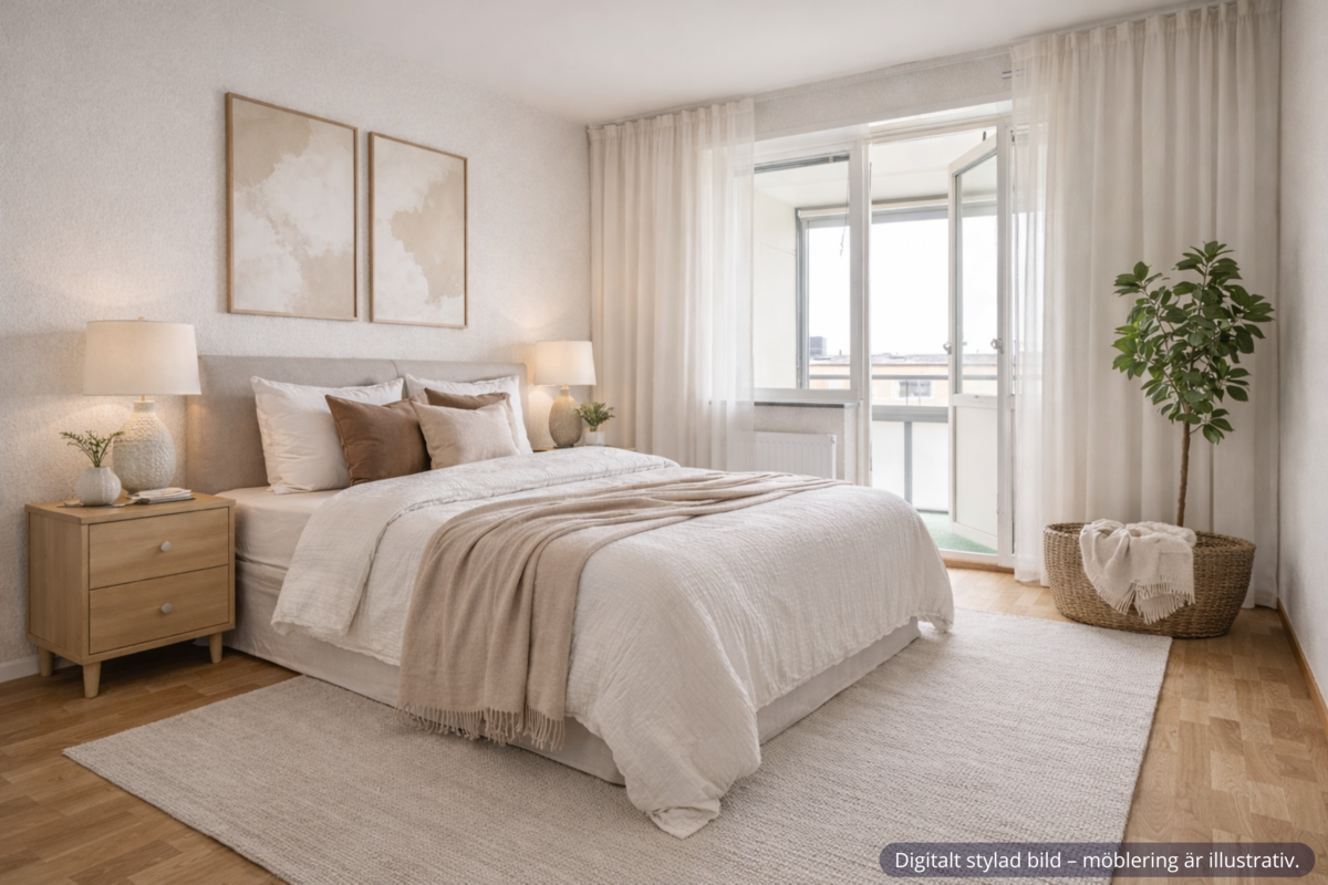 Sovrummet är rofyllt beläget och erbjuder plats för dubbelsäng och direkt access till den stora inglasade balkongen. Balkongen blir snabbt en favoritplats – ett extra rum större delen av året med utsikt över grönska och omgivningar.