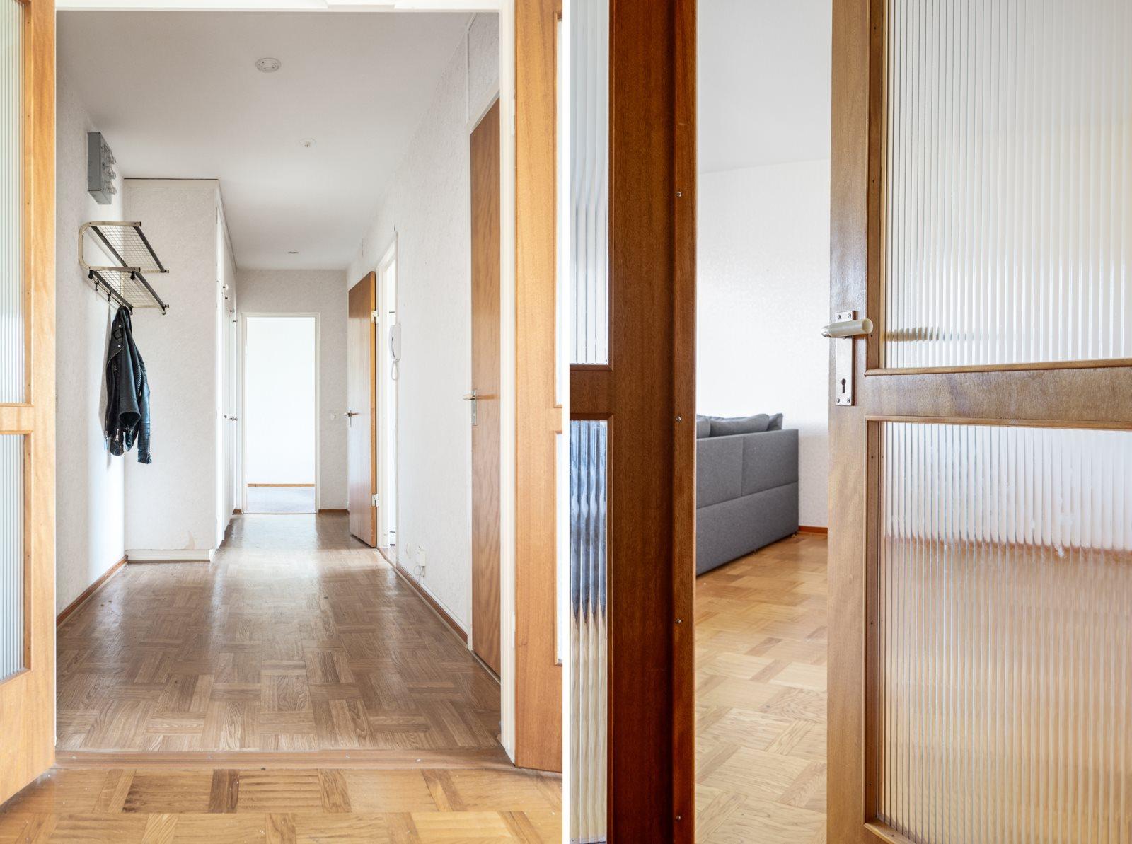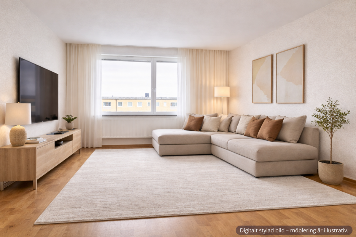 Här bor du ostört med ett fint ljusinsläpp som löper genom hela bostaden. Vardagsrummet är generöst tilltaget med vackert parkettgolv och stora fönsterpartier som skapar en luftig och trivsam atmosfär. Här finns gott om plats för både soffgrupp och matplats för den som önskar.